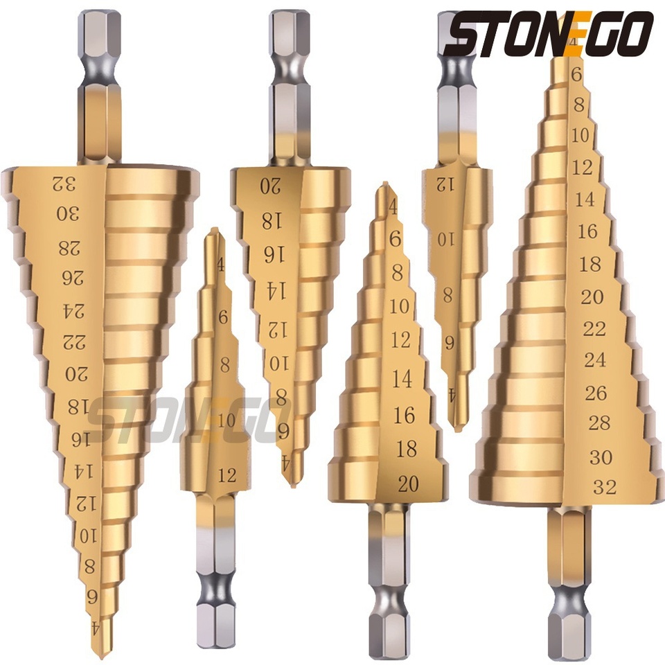 4-12/4-20/4-32mm Hexagonal Straight Groove Titanium Plated Ladder Drill 3pc Pagoda Drill Bit Electric Tool Accessory Set