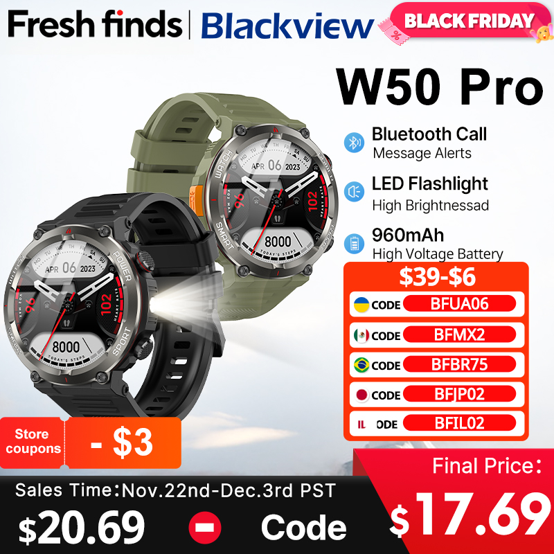 [World Premiere] Blackview W50 Pro Smartwatch 1.45" HD Display Flashlight Bluetooth Phone Call 960mAh Battery Rugged Smartwatch